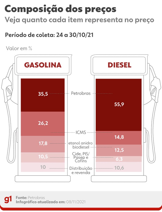 O governo finaliza o texto de uma medida provisória que criará um "fundo de estabilização" para amenizar a alta dos preços do diesel e do gás de cozinha. A medida não deve incluir a gasolina, que tem sofrido as maiores altas dentre os combustíveis. Segundo fontes do governo ouvidas pelo blog, os recursos sairiam: de royalties do petróleo; de dividendos pagos ao Tesouro pela Petrobras; possivelmente, de fundo social administrado pela Pré-Sal Petróleo (PPSA), braço da União na gestão de exploração de óleo e gás, e da Cide Combustíveis, contribuição que hoje ainda incide sobre a gasolina. O aumento no preço dos combustíveis afeta diretamente a vida das pessoas Em fase final, o trabalho conduzido pela Casa Civil, Ministério do Desenvolvimento Regional e Minas e Energia atende a um pedido do presidente Jair Bolsonaro, que tem dito a auxiliares próximos que, atualmente, o problema que mais afeta o governo é a alta dos combustíveis. Em especial, Bolsonaro quer amenizar o preço do diesel, para atender aos caminhoneiros, categoria que o apoia e que vem ameaçando parar se o governo não agir para reduzir os custos de quem roda nas estradas transportando alimentos e bens. Incomoda também ao presidente as piadas e memes que circulam com os preços da gasolina em postos pelo país, que podem se tornar uma dor de cabeça durante o período eleitoral. Bolsonaro queria que o fundo de estabilização amortizasse os preços todos os combustíveis, mas as áreas técnicas têm dito que não há recursos para medida tão ampla. Além disso, é difícil explicar a utilização de recursos públicos para amenizar o preço da gasolina – ao contrário do diesel e gás de cozinha. Mesmo com os preços elevados no país, há uma defasagem dos valores dos combustíveis frente ao mercado internacional. Apesar de a gasolina ter sido reajustada neste ano em mais de 40%, a defasagem segue de quase 20%. O diesel já foi reajustado em 38% e o gás de cozinha em 36%. As principais causas são a alta do barril do petróleo e a desvalorização do real frente ao dólar. Composição dos preços dos combustíveis Arte/g1